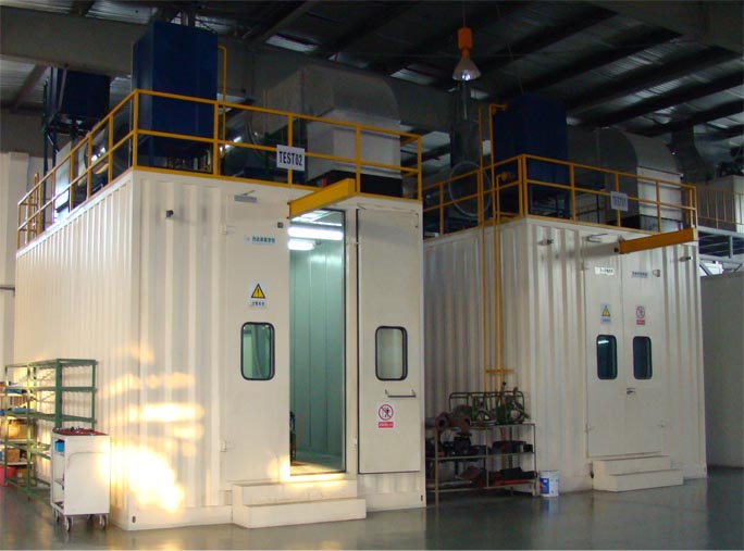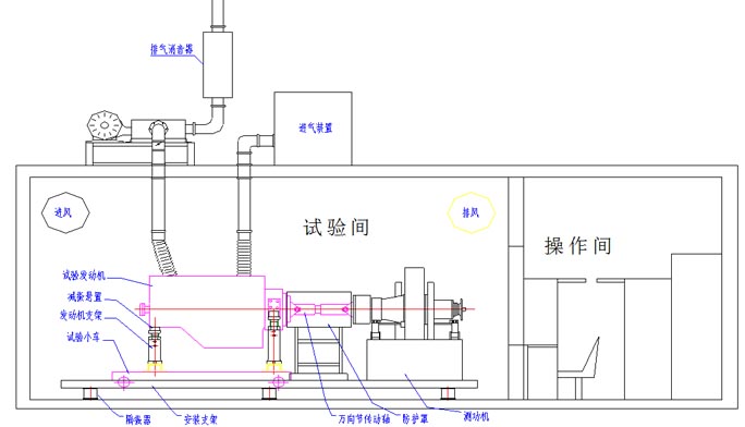 箱體吸隔音采用在箱體內側墻面、頂面安裝吸隔音材料,對門、窗進行隔音處理。吸音和隔音墻壁要求在發動機運轉的所有工況下,測試間外1.5m處噪聲均不得超過85分貝,監控室內噪聲不超過75分貝。